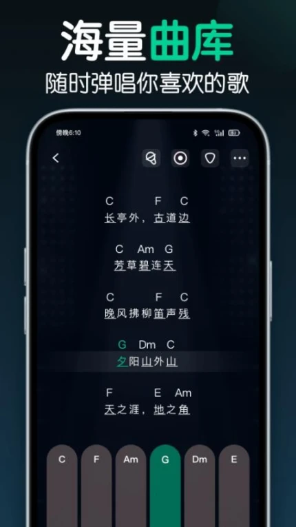 独创的滚动式曲谱播放模式,支持和弦标注与节奏型分解显示,提供单轨静音练习功能,可自由切换主奏与伴奏声部。