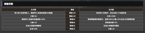 首先是天赋,推荐输出→防御→控制的顺序分配,技能搭配注重“群体控制+爆发输出”的组合,是推图和BOSS战的双场景适配职业。结合天赋面板等级节点:10级解锁“力量+10”,30级点出“狂战士伤害提升翻倍”(右天赋),60级补充“狂战士回复效果翻倍”(左天赋),90级必点“野蛮践踏伤害提升”(右天赋,造成100%力量+50%攻击力的物理伤害),120级解锁“力量+30”(左天赋)。防御分支作为过渡点,30级点1级“群体嘲讽”(强制周围3m敌人攻击自身,CD12秒),60级解锁“受恢复效果+6%”(右天赋),90级点“生命+500”(左天赋),120级补“生命+2500”(右天赋)。控制分支后期补点,150级解锁“释放死亡龙卷时净化自身1个负面状态”(右天赋)和“若只有1名相邻敌人,释放死亡龙卷后回复500能量”(左天赋),增强持续作战能力。