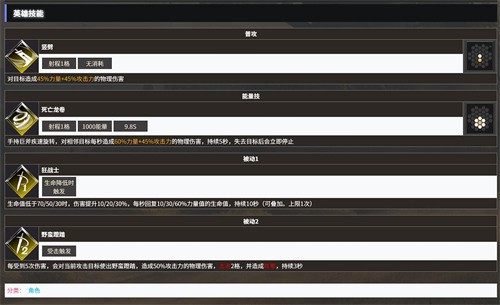 普攻“竖劈”:射程1格,造成45%力量+45%攻击力的物理伤害,无消耗,是能量积累的主要方式(每次普攻回复能量约80点)。能量技“死亡龙卷”:需1000能量、冷却9.8秒,手持巨斧旋转5秒,对相邻目标每秒造成60%力量+45%攻击力的物理伤害,失去目标立即停止。该技能是核心输出手段,配合90级左天赋“伤害减免+50%”可在人群中站桩输出,150级双天赋进一步强化其生存与能量回复。