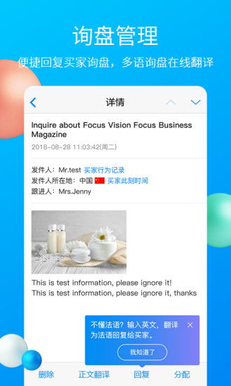 在app首页或询盘管理页面,用户可以查看所有收到的询盘。点击具体询盘,可以查看详细信息并进行回复。app还支持询盘单词翻译功能,帮助用户更好地与买家沟通。